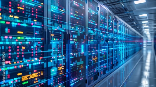 Rows of illuminated servers in a modern data center, showcasing advanced technology and infrastructure for data processing and storage.