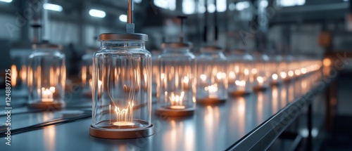 Rows of intricate bulbs glow warmly on an assembly line, highlighting the fusion of craftsmanship and industrial might in a modern factory.