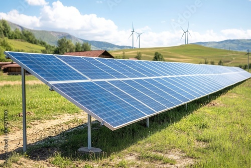 Rows of large solar panels capture the warm sunrise light, while wind turbines spin gently in the background. The farm, surrounded by open fields and green hills, showcases a commitment to renewable e