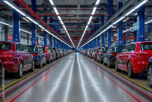 Rows of luxury cars lined up in a modern automotive assembly facility during the day
