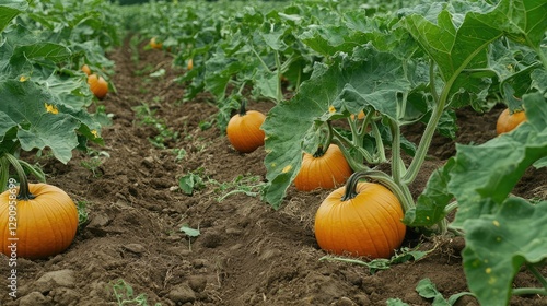 Rows of mature pumpkin plants, large leaves and bright orange fruits providing natural space for farming copy.