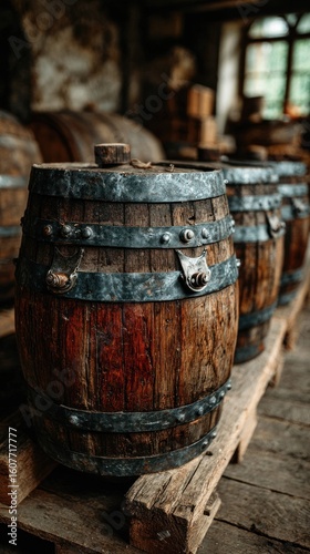 Rows of oak barrels with metal hoops sit on a wood pallet inside a cellar