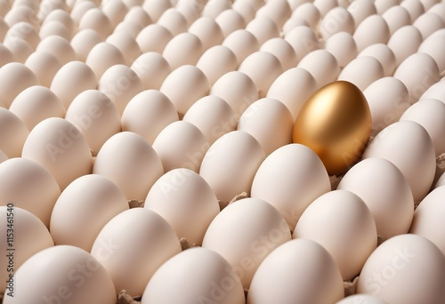 Rows of white eggs with one golden egg standing out among them