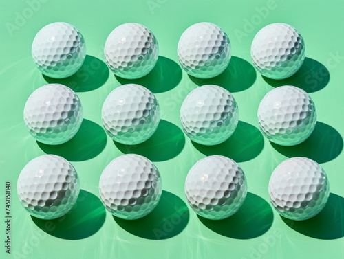 Rows of white golf balls on a green surface under soft light, showcasing pattern and repetition