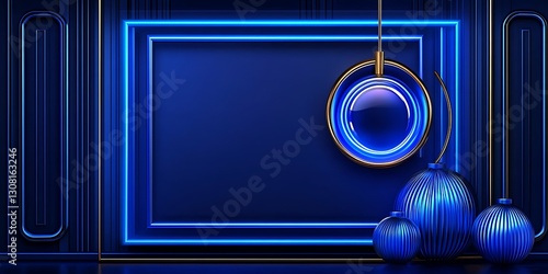 Royal blue scene with a neon frame and decorative hanging ornaments