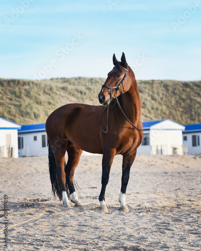 Royal Dutch Sport Horse on the beach of Katwijk with little houses on the background