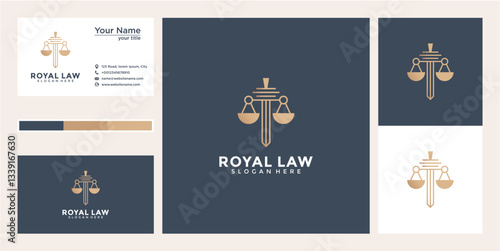 Royal Law Firm Logo Design: Gold Scales and Sword Icon on Dark Background