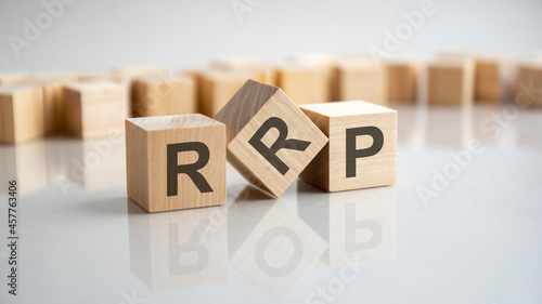 RRP - Recommended Retail Price acronym concept on cubes, gray background