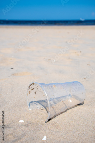 Rubbish plastic disposable cup abandoned on sandy beach with the sea on background, plastic pollution, vertical