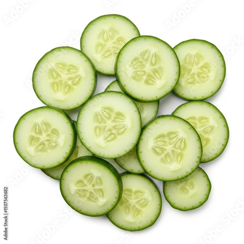 Ruedas de pepino cortadas, vista superior, fotografía sobre fondo blanco