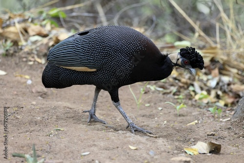 Ruffed Guinea Fowl (Guttera pucherani), adult, on the ground, alert, foraging, Kruger, Kruger National Park, South Africa