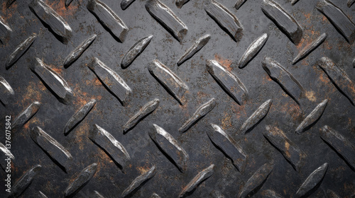 rugged and heavily worn steel plate background showcases textured surface with raised diamond patterns, evoking sense of industrial strength and durability