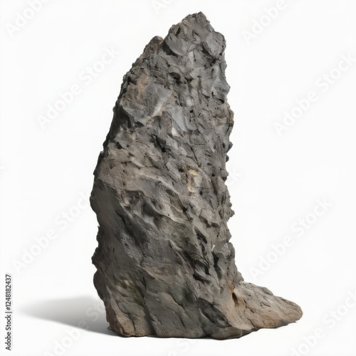 Rugged and Natural Dark Grey Rock Formation Standing Upright on White Background with Jagged Texture