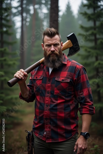 Rugged Caucasian Man in a Plaid Shirt Holding a Wooden Axe in a Forest