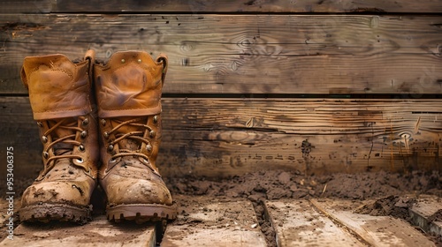 Rugged Leather Boots Stained with Mud Against Rustic Wooden Background