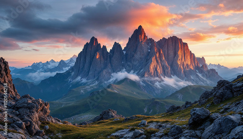 Rugged mountain peaks at sunset with dramatic lighting and a lush, rocky landscape.