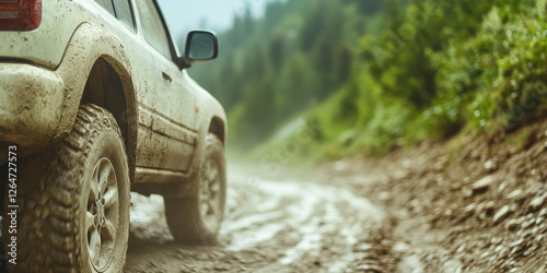 Rugged off road vehicle driving through muddy forest trail adventure travel concept