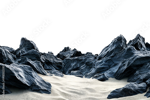 Rugged volcanic rocks with smooth textures and dark sand in a dramatic landscape isolated on transparent background