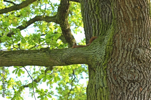 Ruhendes Eichhörnchen (Sciurus vulgaris) auf Eichenast im Frühling