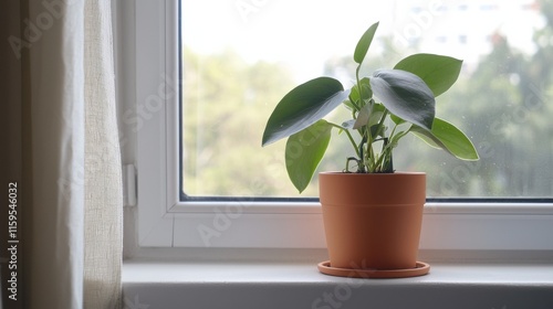 Ruhiger urbaner Rückzugsort: Topfpflanze im hellen Stadtloft am Fenster