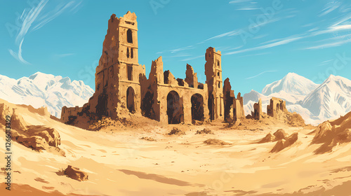 Ruins of a once grand building stand in desert sand. Sands of Forgotten Ages. Illustration