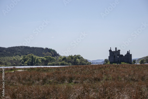 Ruins of an ancient castle by the water in Scotland on a clear day with lush greenery in the background