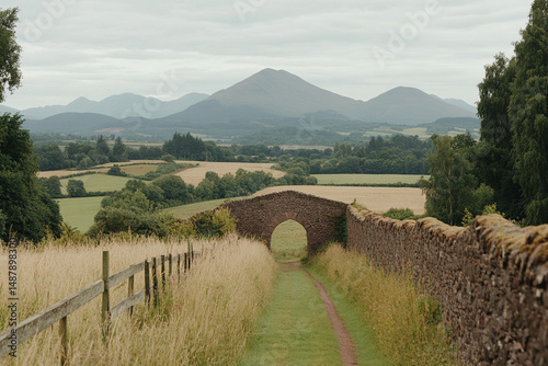 Ruins of an ancient stone archway amidst lush fields and distant rolling hills under a cloudy sky