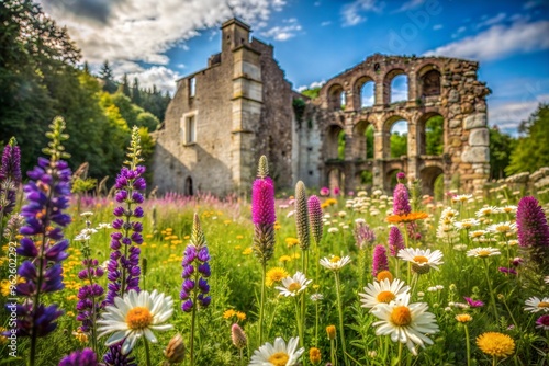 Ruins of ancient stone building amidst vibrant wildflowers in forest landscape on bright day