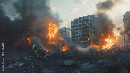 Ruins of city buildings burning and collapsing after intense missile strikes, symbolizing the devastation of conflict