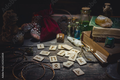 Runes for divination on fortune teller desk table background. Futune reading concept.