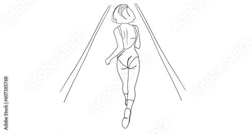 Runner woman running outline vector illustration. Runner woman running training, healthy fitness sport lifestyle. Active female athlete jogging outdoors line artwork. Back side view.