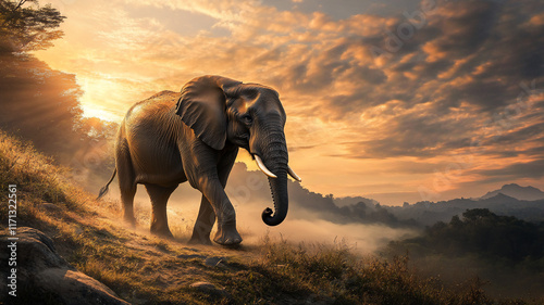 running elephant during sunrise in a mountain with a eye-level angle