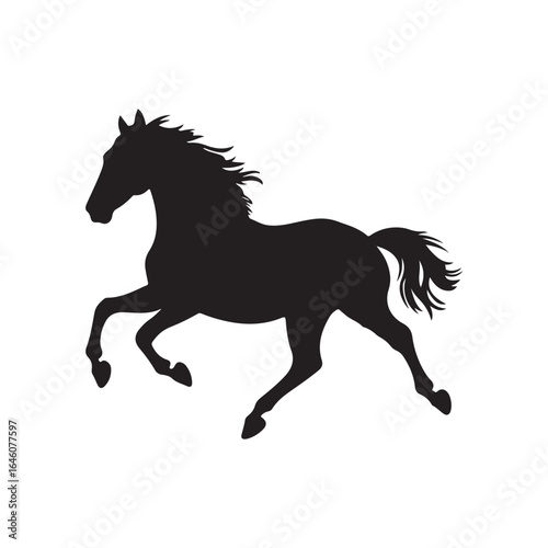 Running horse silhouette, Running horse vector illustration, Silhouette of a horse running black vector art illustration, Solid black vector silhouette of a horse in motion.