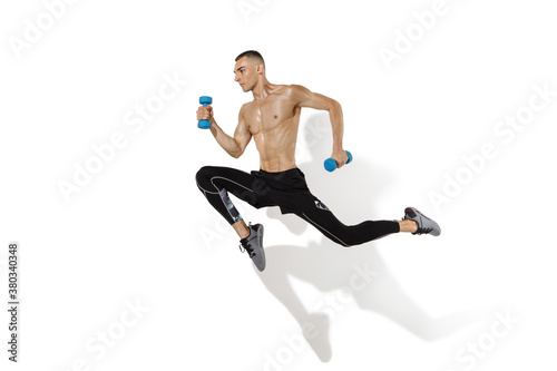 Running, jumping high. Stylish young male athlete on white studio background, portrait with shadows. Sportive fit model in motion and action. Body building, healthy lifestyle, style concept.