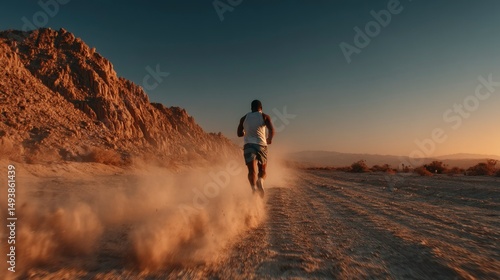 Running Man in Desert Landscape at Sunset Dusty Trail Fitness Motivation Outdoor Adventure