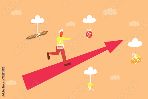 Running man with shopping basket and increasing arrow. Concept of rising prices