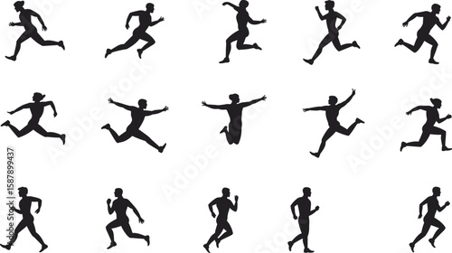 Running Silhouettes Grid Set, Various Dynamic Jogging and Sprinting Poses Illustrating Human Motion for Sports, Fitness, Athlete Training Art