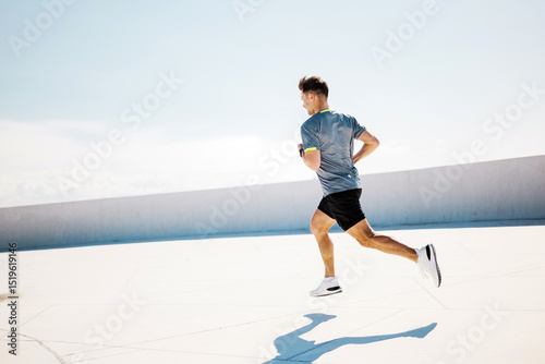Running Under a Bright Sun on a Rooftop, a Young Man Embraces the Freedom of Movement and the Joy of Exercise While Showcasing Vitality and Determination