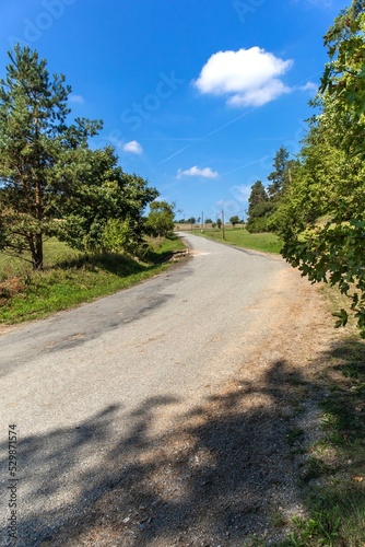 Rural asphalt road in the Czech Republic. Morning in the countryside. Road in summer landscape. A place for vacation.