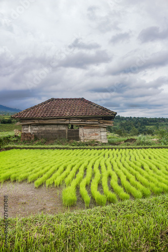 Rural Bali scenery with green rice field and a hut used to save cattle. Agriculture in Indonesia concept. In Jatiluwih