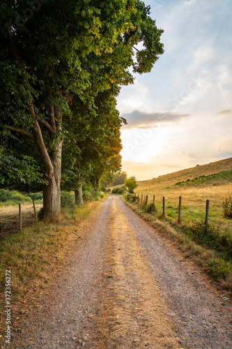 Rural country road on the Swedish west coast during golden sunset. Selective focus.