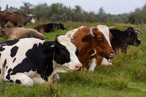 Rural cows graze on a green meadow. Rural life. Animals. agricultural country