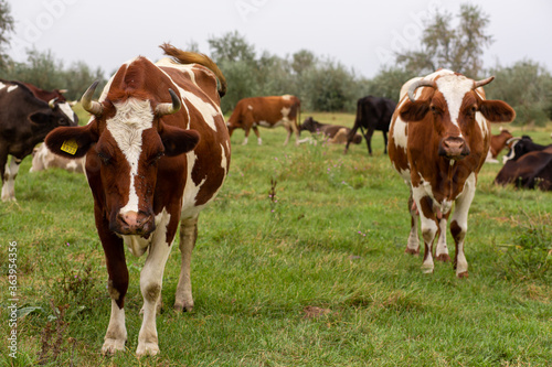 Rural cows graze on a green meadow. Rural life. Animals. agricultural country