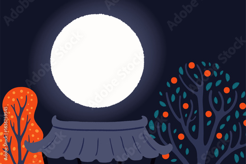 Rural Korean night landscape, scene with traditional house hanok roof, persimmon, autumn trees, full moon. Chuseok, Mid Autumn Festival background, design elements. Hand drawn flat vector illustration