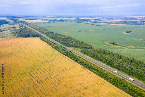 Rural landscape. Drone view of farm fields divided by the road on sunny summer day. Saratov Oblast, Russia.