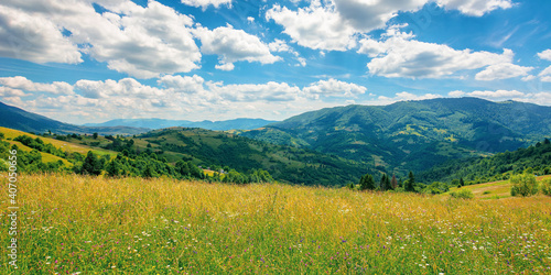 rural landscape with blooming grassy meadow. beautiful nature scenery of carpathian mountains on a sunny day. fluffy clouds on the blue sky