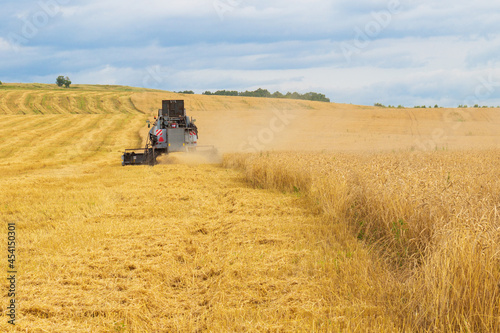 Rural landscape with combine harvester harvest ripe wheat in the field at the end of summer. Farming agricultural background. Back view