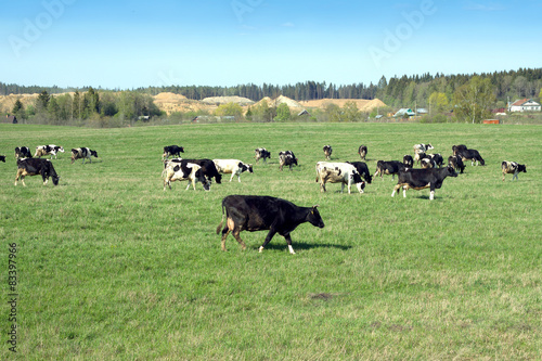 Rural landscape with cows on meadow in summer day