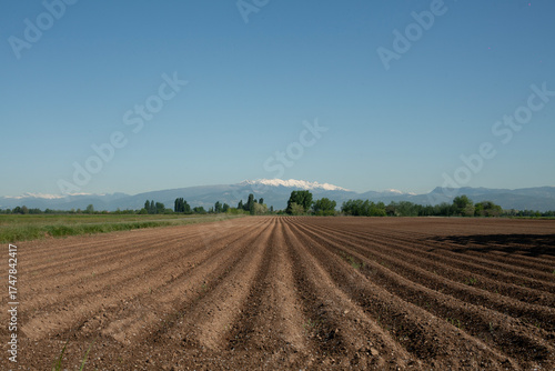 Rural landscape with plowed field, trees, and snow-capped mountain in the background