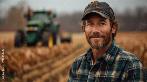 Rural Life: Farmer man Working in Fields with Tractor in Background